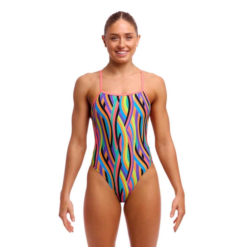 Жіночий купальник Twisted One Piece від Funkita пропонує вам абсолютну свободу рухів під час тренувань. Ремені вміло з’єднуються ззаду та скручуються; це не тільки виглядає красиво, але й мінімізує тертя під час плавання. Купальник має високий виріз для штанин і вирізи з боків. Щоб він був непрозорим у важливих місцях, він підкладений зсередини в передній частині.